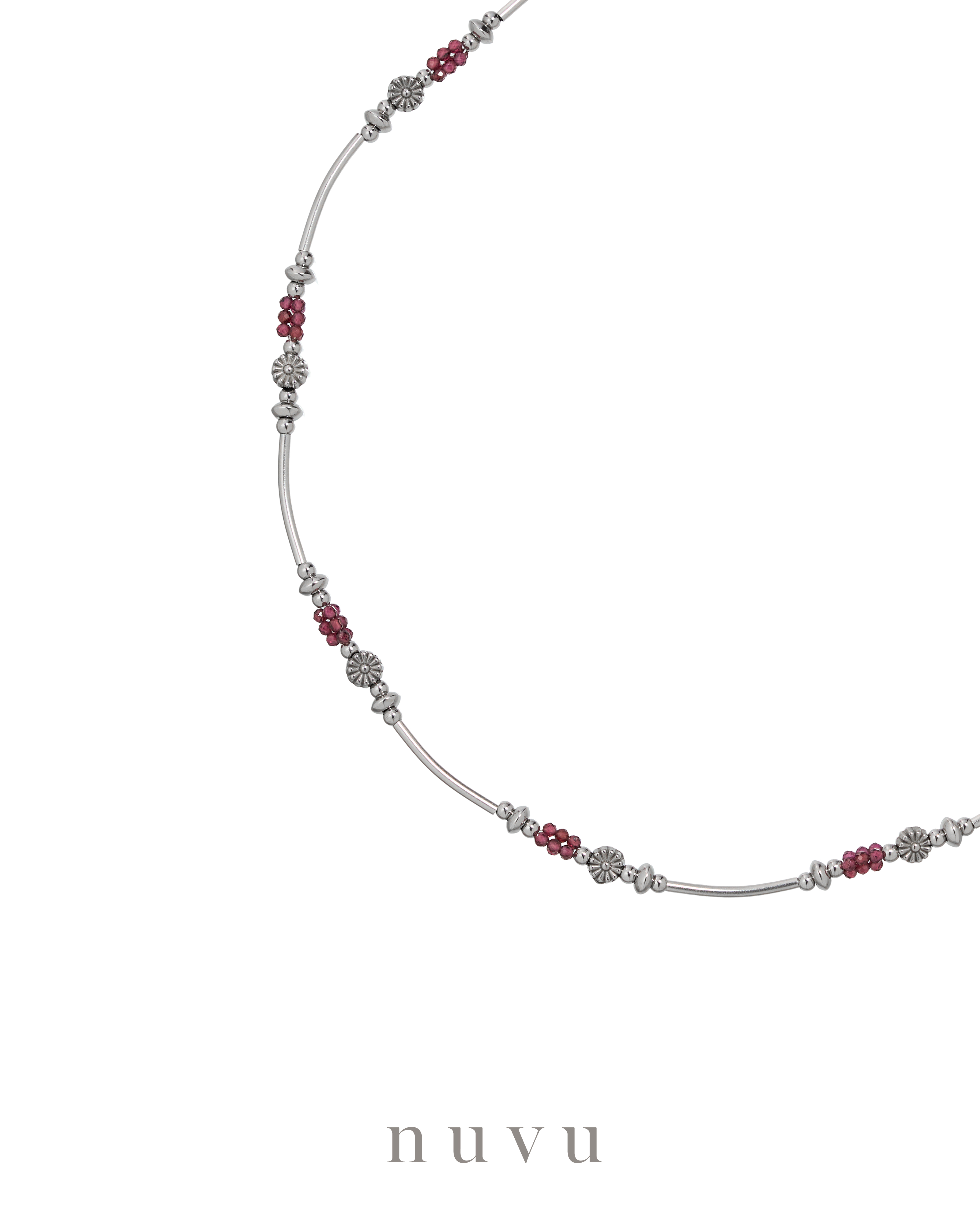 NUVU · Blooming Garnet Series A woman’s true allure is never loud — it blooms quietly, just like a flower… and yet, no one can ignore it. Introducing NUVU’s latest Blooming Garnet Series, crafted with deep wine-red Rhodolite Garnet and adorned with delicate daisy elements — a symbol of soft strength and feminine resilience. Because women and flowers are deeply connected: both gentle, both powerful, both capable of blooming even after the storm. 💎 Rhodolite Garnet — The one energy every woman needs Flowers need sunlight. Women need healthy "Qi" & blood flow. Garnet is known as the “life-force stone” — perfect for anyone struggling with dull complexion, cold hands and feet, fatigue, emotional dips, or lack of radiance. It supports you by: • Boosting "Qi" & blood circulation — reviving natural glow and liveliness • Enhancing confidence & feminine charm — beauty that radiates from within • Restoring vitality — reducing fatigue and reigniting passion for life • Soothing negative emotions — easing sadness, stress, and emotional heaviness • Attracting love & opportunities — as the classic “stone of passion” • Protecting your energy field — keeping negativity away and strengthening your aura When your "Qi" and blood flow improves, your complexion brightens, your eyes regain their spark, your spirit feels alive again. That’s not magic — that’s your energy finally flowing the way it should. Crystal : Garnet Material : Stainless Steel Bead size : 3mm Necklace : 40cm / 60cm Delivery Time : All our designs are meticulously handcrafted, which requires time for production. Kindly allow 7-14 days for delivery to your doorstep. Any special enquiry please contact our customer service.