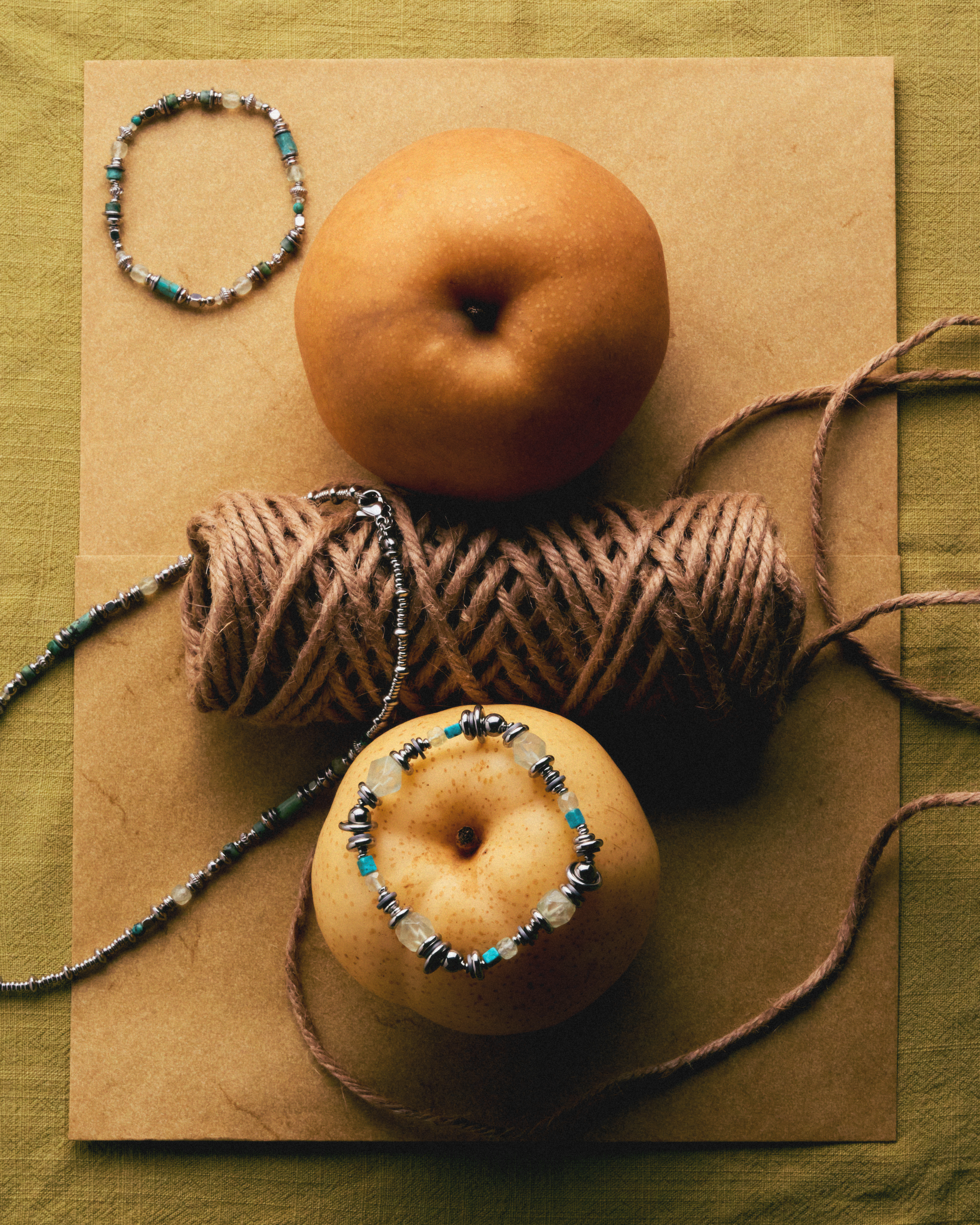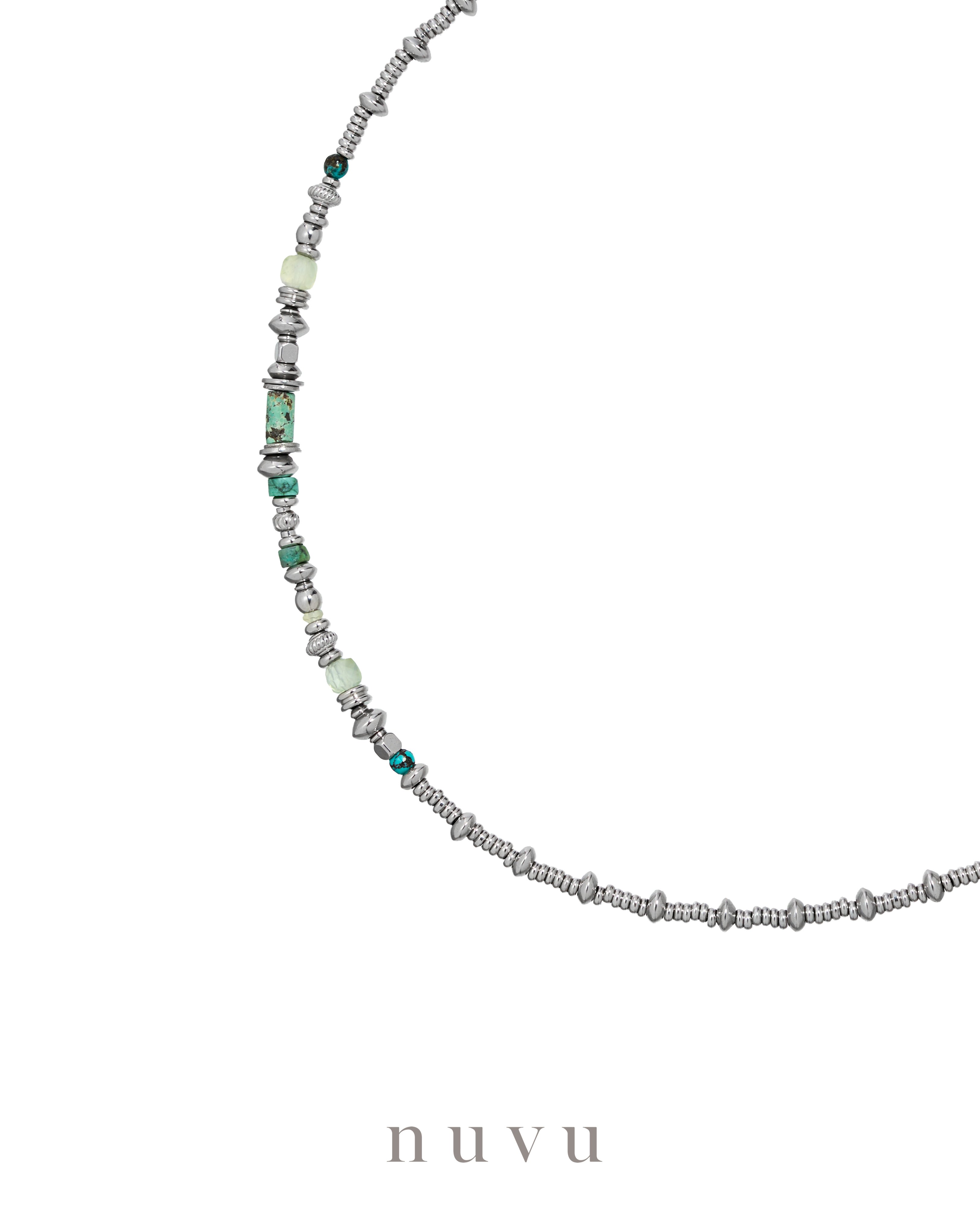 NUVU · Fresh Current Series A clean, refreshing take on prosperity — where abundance flows in gently and clearly. This new NUVU series pairs crystal-clear Prehnite with vibrant Turquoise, creating a layered design that feels light, balanced, and effortlessly refined. Because wealth doesn’t always need to arrive loudly — sometimes, it flows in quietly, steadily, and cleanly. Prehnite, known as the Stone of Hope, carries restorative and healing energy. It strengthens perseverance and confidence, helps you stay focused, and gently guides you toward choices that truly align with you. Often regarded in Western cultures as a Stone of Wealth, Prehnite supports steady career growth and healthy financial flow, especially during moments of stagnation or self-doubt. It encourages calm, rational thinking — so new opportunities can emerge naturally. Turquoise, long celebrated as the Stone of Success and Luck, adds courage, protection, and warmth to the series. It soothes anxiety, stabilizes emotions, and helps you stay grounded under pressure. At the same time, it opens the heart, improves communication, strengthens relationships, and attracts supportive people and positive outcomes. In many cultures, it symbolizes protection, happiness, and abundance. Together, they create a frequency of clean wealth, calm confidence, and sustainable growth — helping you move forward with clarity, courage, and inner balance. A series for those who want success that feels aligned, not forced. Fresh, steady, and quietly powerful. Crystal : Prehnite, Turquoise Material : Stainless Steel Bead size : 6mm-8mm Necklace : 40+5cm Delivery Time : All our designs are meticulously handcrafted, which requires time for production. Kindly allow 7-14 days for delivery to your doorstep. Any special enquiry please contact our customer service.