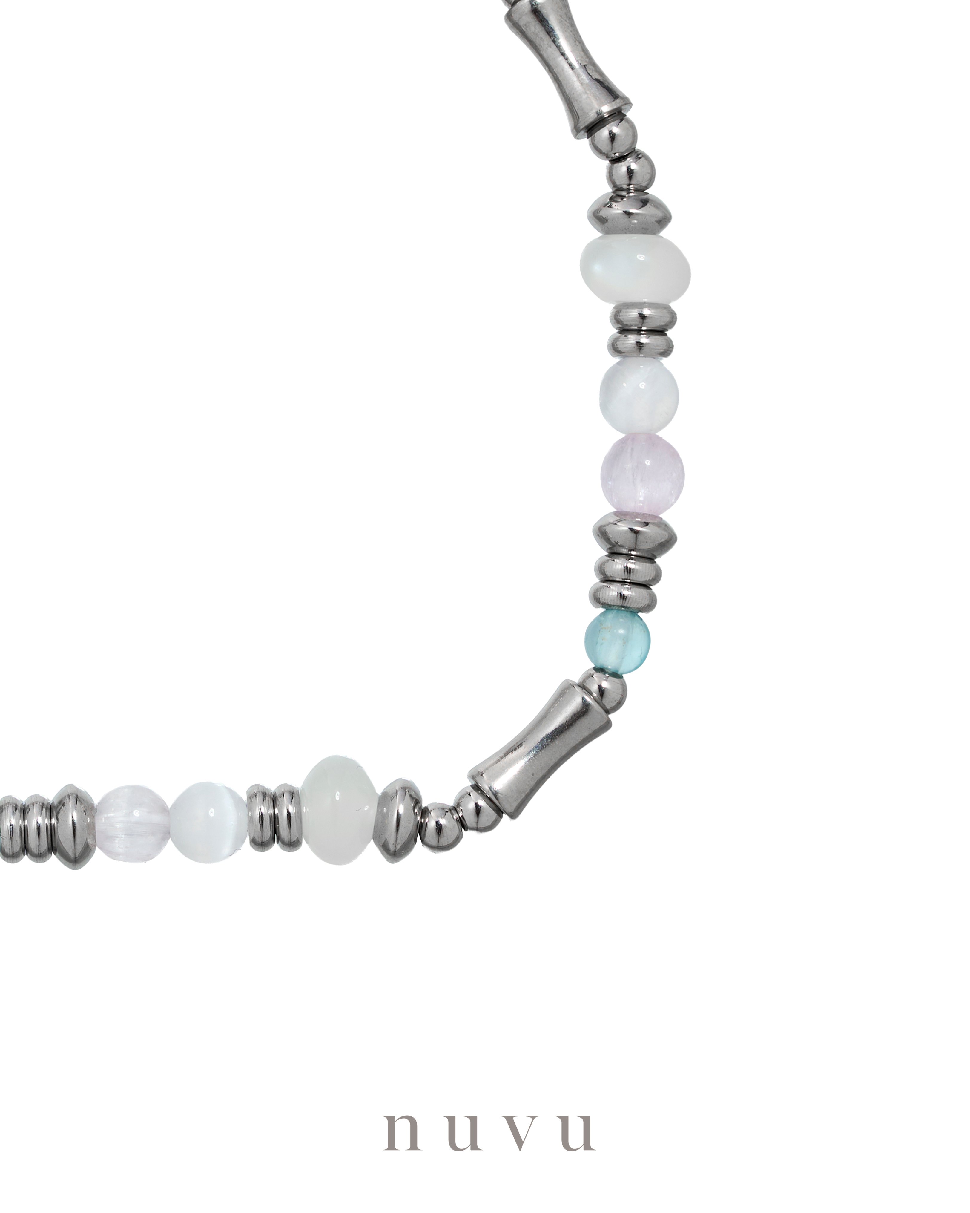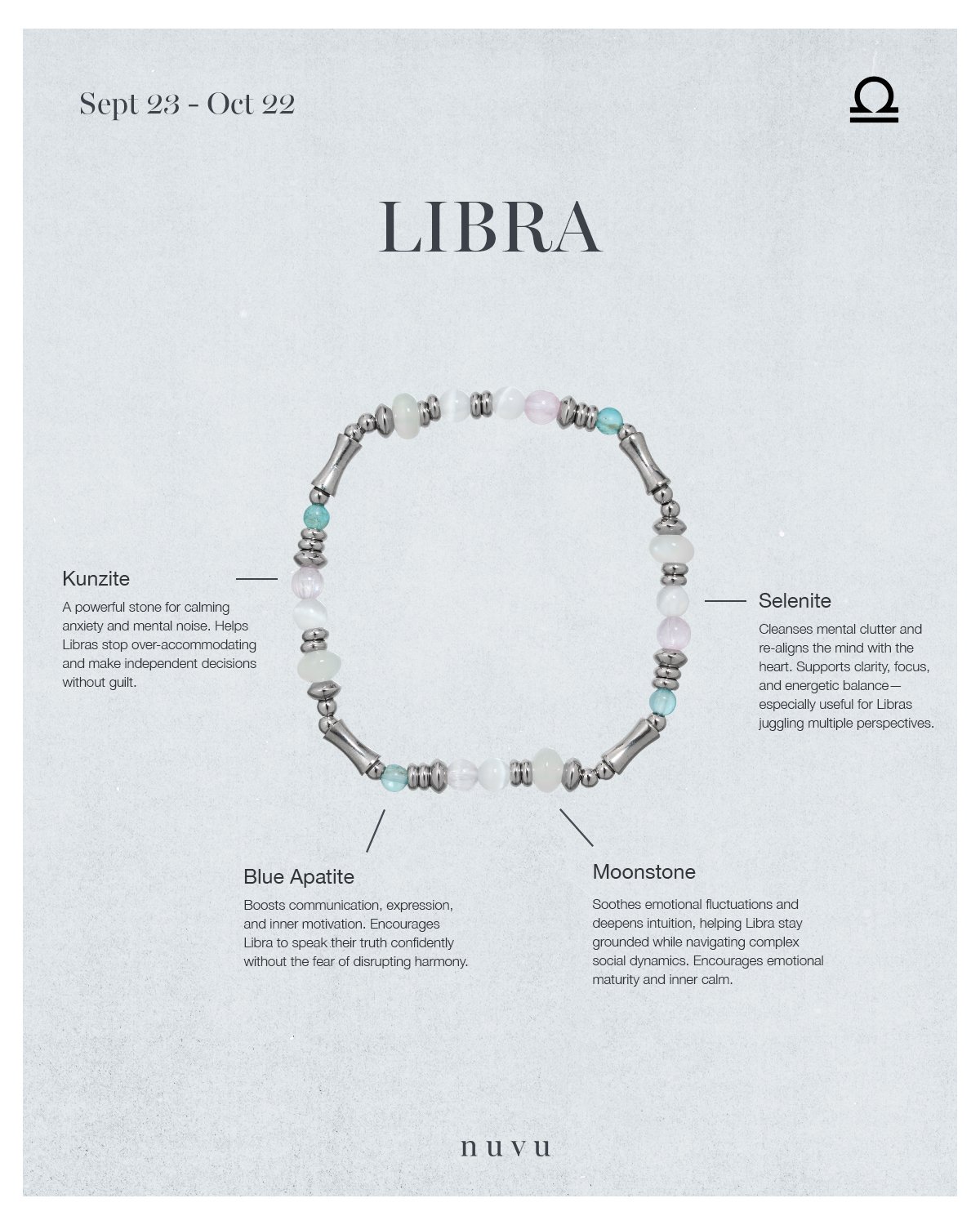 NUVU 2025 Limited Zodiac Collection October: Libra Collection Strengths: Graceful, diplomatic, and naturally peace-loving — Libras bring balance and beauty wherever they go. With a deep sense of fairness, they value harmony, art, and meaningful connections. Their charm and social intelligence often make them the glue that holds people together. Challenges: Libras’ desire to maintain peace can sometimes lead to indecision or people-pleasing. They may avoid confrontation at the expense of their authenticity, feeling torn between multiple perspectives. When overwhelmed, they can retreat emotionally, appearing detached or indecisive. For Libra: Moonstone Soothes emotional fluctuations and deepens intuition, helping Libra stay grounded while navigating complex social dynamics. Encourages emotional maturity and inner calm. Kunzite A powerful stone for calming anxiety and mental noise. Helps Libras stop over-accommodating and make independent decisions without guilt. Selenite Cleanses mental clutter and re-aligns the mind with the heart. Supports clarity, focus, and energetic balance—especially useful for Libras juggling multiple perspectives. Blue Apatite Boosts communication, expression, and inner motivation. Encourages Libra to speak their truth confidently without the fear of disrupting harmony. For the Libra who always seeks balance — Let this set remind you: peace begins within. Crystal: Moonstone, Kunzite, Selenite, Blue Apatite Material: Stainless Steel Bead size: 4–6mm Bracelet : 16cm Delivery Time : All our designs are meticulously handcrafted, which requires time for production. Kindly allow 7-14 days for delivery to your doorstep. Any special enquiry please contact our customer service.