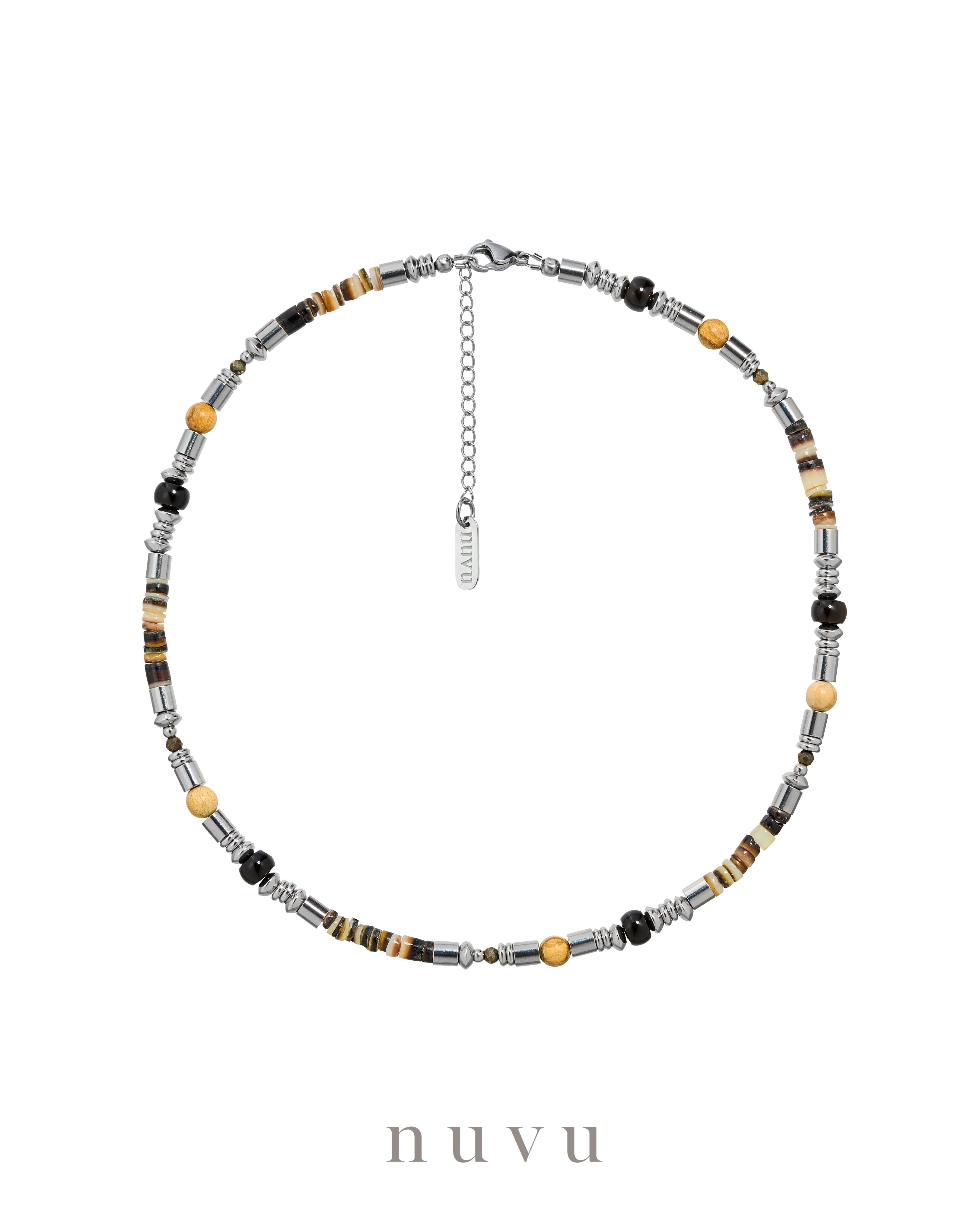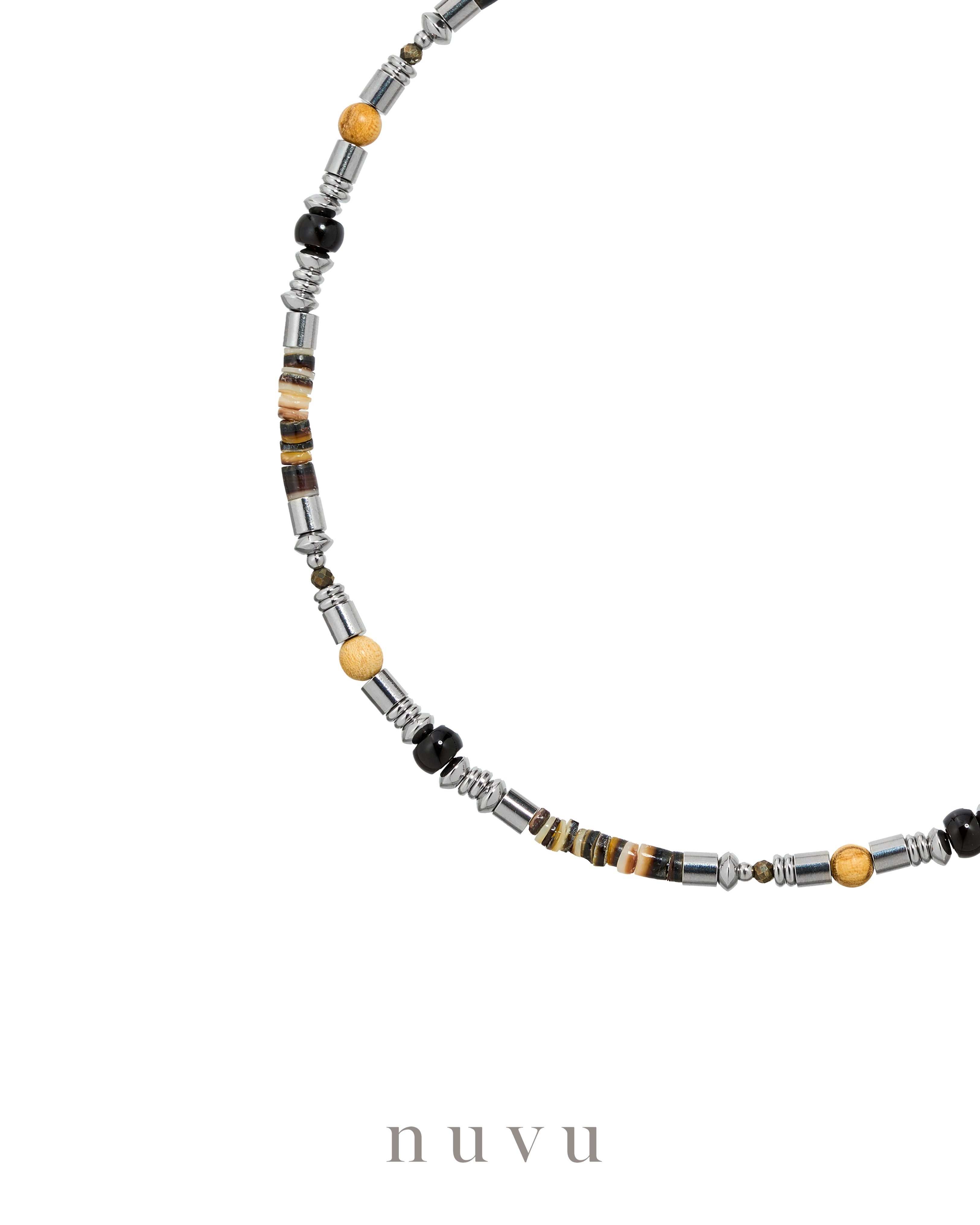 NUVU · Sacred Wood Series Purify · Ground · Renew — your daily source of calm and clarity. Palo Santo has long been a NUVU favorite — its sacred cleansing energy has helped countless customers clear negativity, ease tension, and reset their inner state. As one of the most revered woods in spiritual traditions, Palo Santo purifies the aura, strengthens your energetic field, and quiets the mind. Its natural scent brings a comforting sense of peace, helping you relax deeply and sleep better. In the Sacred Wood Series, we pair Palo Santo with Smoky Quartz for emotional grounding and stability, and Chalcopyrite for wealth attraction and clearing stagnant or “unlucky” energy. Together, they create a powerful trio of purification and renewal: Palo Santo cleanses and uplifts, Smoky Quartz steadies your emotions and melts anxiety, Pyrite activates luck, opportunity, and energetic flow. Whenever life feels heavy, chaotic, or overwhelming, this series becomes your gentle sanctuary — a reminder to breathe, release, and realign. ✨ Sacred Wood Series Cleanse what weighs you down. Ground your heart. Invite luck and renewal into your space. Carry this sacred trio with you, and let your energy flow lighter, clearer, and beautifully aligned. Crystal : Palo Santo, Smoky Quartz, Pyrite, Shell Material : Stainless Steel Bead size : 4-6mm Necklace : 40+5cm Delivery Time : All our designs are meticulously handcrafted, which requires time for production. Kindly allow 7-14 days for delivery to your doorstep. Any special enquiry please contact our customer service.