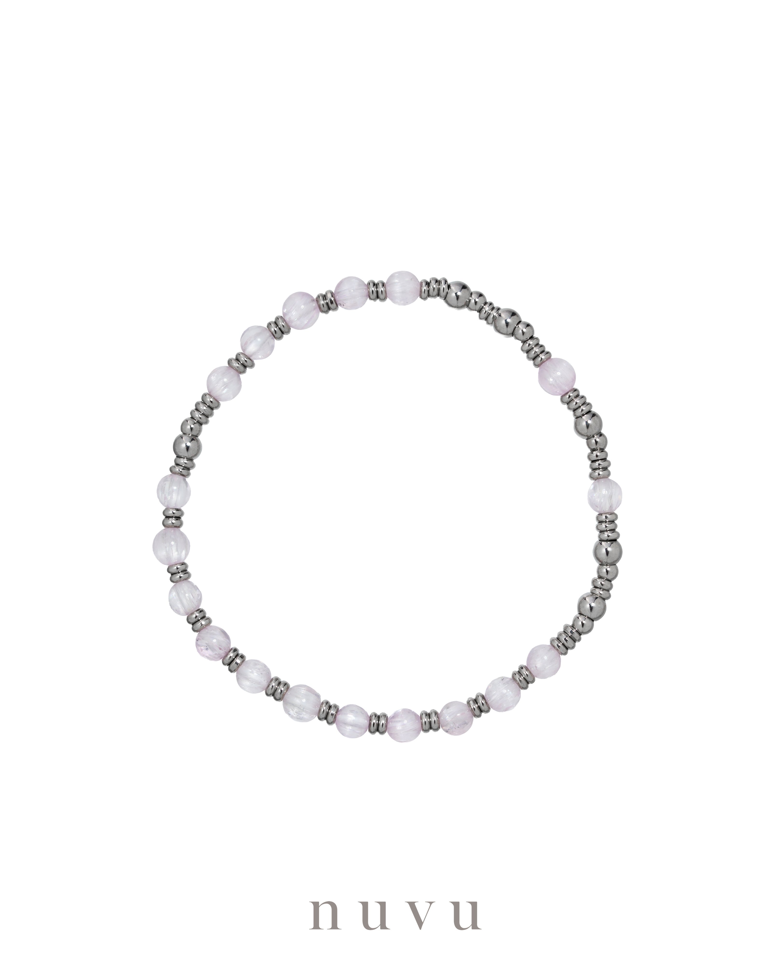 NUVU · Lucent Bloom Series She carries a radiant title — the “Queen of Crystals.” Known for its noble and healing energy, Kunzite has long been cherished, but the rare threaded icy-transparent Kunzite is even more precious. Its soft lavender hue, clear as morning mist, with delicate natural striations hidden within, is subtle yet profound — a beauty that captures you at first glance, and grows deeper the longer you gaze. This time, NUVU combines Kunzite with Rose Quartz,Citrine and Ice Obsidian, creating a powerful all-in-one energy formula. Like champagne bubbles sparkling in the glass, it blooms with light — a celebration of abundance and joy. Kunzite:The healer of emotions. Dissolves tension and negative thoughts, bringing calm, clarity, and balance. In relationships, it acts as a bridge, helping to attract true love, repair fractures, and rebuild trust. Citrine: The booster of wealth and confidence. Strengthens determination, radiates optimism and courage, and magnetically draws prosperity and opportunities. Rose Quartz: The stone of love and compassion. It opens the heart, nurtures self-love, enhances charm, and deepens bonds in both romance and friendships. Ice Obsidian: A shield of clarity and protection. Stabilizes energy, clears inner chaos, and wards off negativity and misfortune, keeping you aligned with fortune and focus ✨ Lucent Bloom Series More than the elegance of the Queen of Crystals, it is a spectrum of guidance and empowerment. True abundance doesn’t come from waiting — it blossoms from within. Whether shining in the crowd or healing in solitude, Lucent Bloom will be your graceful guardian, leading you toward radiance and wholeness. Crystal : Highgrade Kunzite, Citrine, Ice Obsidian, Rose Quartz Material : Stainless Steel Bead size : 4mm Bracelet : 16cm Delivery Time : All our designs are meticulously handcrafted, which requires time for production. Kindly allow 7-14 days for delivery to your doorstep. Any special enquiry please contact our customer service.
