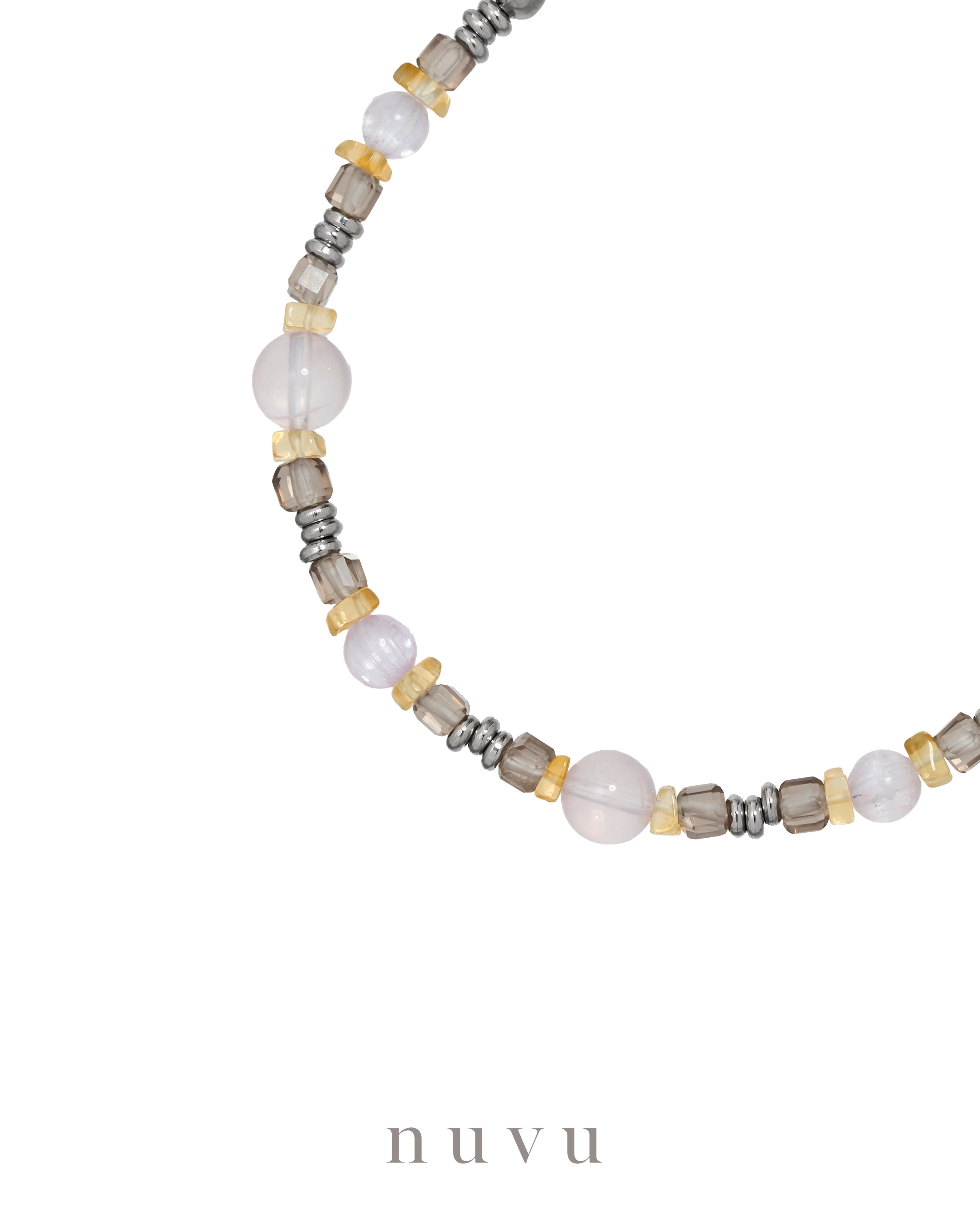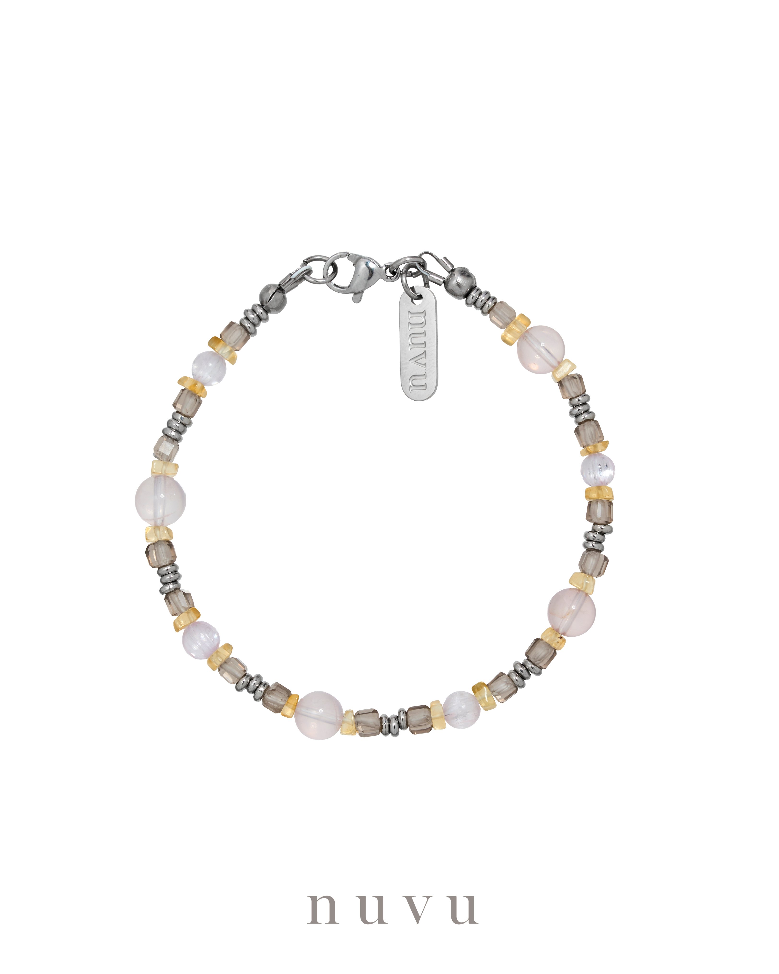 NUVU · Lucent Bloom Series She carries a radiant title — the “Queen of Crystals.” Known for its noble and healing energy, Kunzite has long been cherished, but the rare threaded icy-transparent Kunzite is even more precious. Its soft lavender hue, clear as morning mist, with delicate natural striations hidden within, is subtle yet profound — a beauty that captures you at first glance, and grows deeper the longer you gaze. This time, NUVU combines Kunzite with Rose Quartz,Citrine and Ice Obsidian, creating a powerful all-in-one energy formula. Like champagne bubbles sparkling in the glass, it blooms with light — a celebration of abundance and joy. Kunzite:The healer of emotions. Dissolves tension and negative thoughts, bringing calm, clarity, and balance. In relationships, it acts as a bridge, helping to attract true love, repair fractures, and rebuild trust. Citrine: The booster of wealth and confidence. Strengthens determination, radiates optimism and courage, and magnetically draws prosperity and opportunities. Rose Quartz: The stone of love and compassion. It opens the heart, nurtures self-love, enhances charm, and deepens bonds in both romance and friendships. Ice Obsidian: A shield of clarity and protection. Stabilizes energy, clears inner chaos, and wards off negativity and misfortune, keeping you aligned with fortune and focus ✨ Lucent Bloom Series More than the elegance of the Queen of Crystals, it is a spectrum of guidance and empowerment. True abundance doesn’t come from waiting — it blossoms from within. Whether shining in the crowd or healing in solitude, Lucent Bloom will be your graceful guardian, leading you toward radiance and wholeness. Crystal : Highgrade Kunzite, Citrine, Ice Obsidian, Rose Quartz Material : Stainless Steel Bead size : 4mm Bracelet : 16cm Delivery Time : All our designs are meticulously handcrafted, which requires time for production. Kindly allow 7-14 days for delivery to your doorstep. Any special enquiry please contact our customer service.