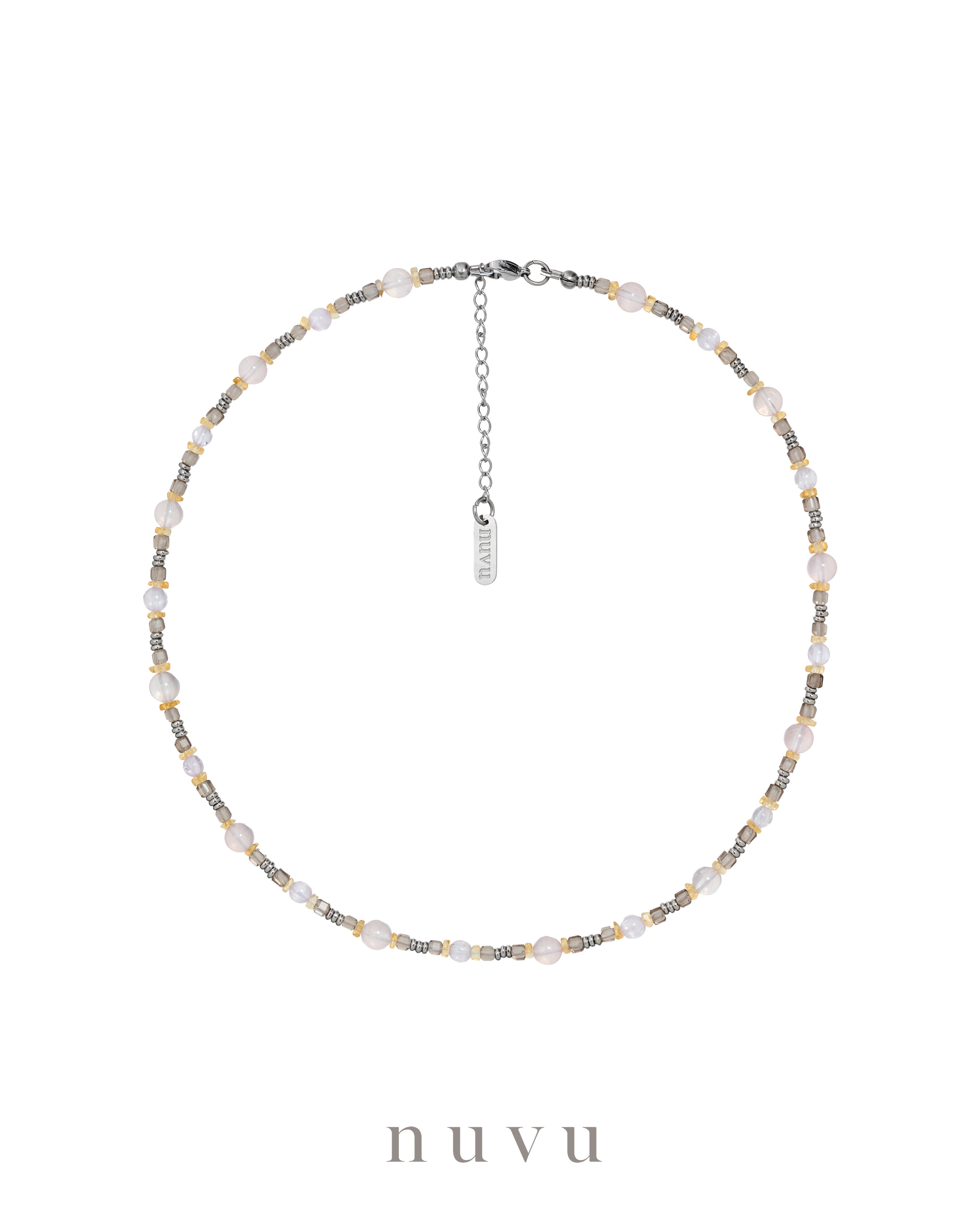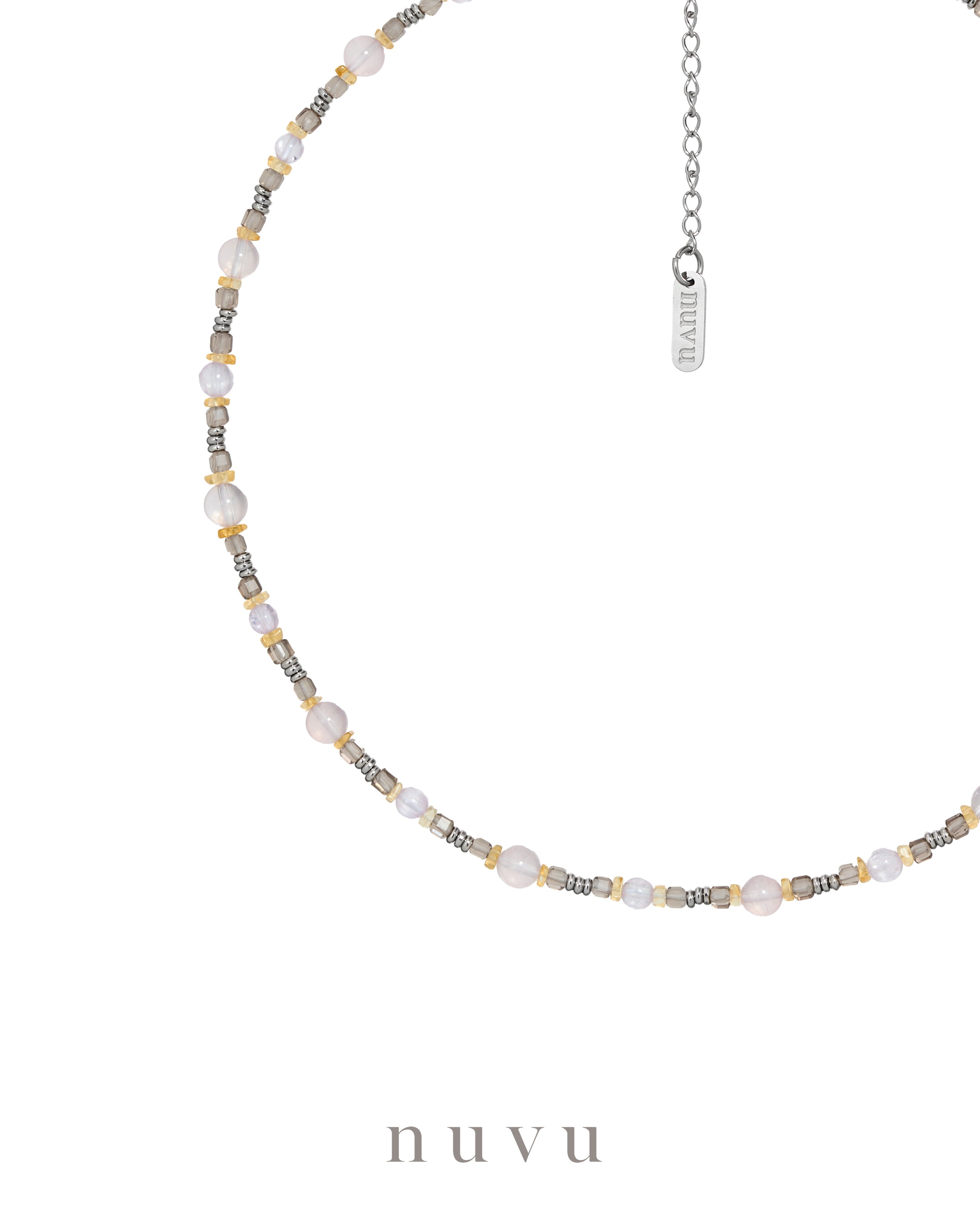 NUVU · Lucent Bloom Series She carries a radiant title — the “Queen of Crystals.” Known for its noble and healing energy, Kunzite has long been cherished, but the rare threaded icy-transparent Kunzite is even more precious. Its soft lavender hue, clear as morning mist, with delicate natural striations hidden within, is subtle yet profound — a beauty that captures you at first glance, and grows deeper the longer you gaze. This time, NUVU combines Kunzite with Rose Quartz,Citrine and Ice Obsidian, creating a powerful all-in-one energy formula. Like champagne bubbles sparkling in the glass, it blooms with light — a celebration of abundance and joy. Kunzite:The healer of emotions. Dissolves tension and negative thoughts, bringing calm, clarity, and balance. In relationships, it acts as a bridge, helping to attract true love, repair fractures, and rebuild trust. Citrine: The booster of wealth and confidence. Strengthens determination, radiates optimism and courage, and magnetically draws prosperity and opportunities. Rose Quartz: The stone of love and compassion. It opens the heart, nurtures self-love, enhances charm, and deepens bonds in both romance and friendships. Ice Obsidian: A shield of clarity and protection. Stabilizes energy, clears inner chaos, and wards off negativity and misfortune, keeping you aligned with fortune and focus ✨ Lucent Bloom Series More than the elegance of the Queen of Crystals, it is a spectrum of guidance and empowerment. True abundance doesn’t come from waiting — it blossoms from within. Whether shining in the crowd or healing in solitude, Lucent Bloom will be your graceful guardian, leading you toward radiance and wholeness. Crystal : Highgrade Kunzite, Citrine, Ice Obsidian, Rose Quartz Material : Stainless Steel Bead size : 4mm Necklace :40cm +5cm Delivery Time : All our designs are meticulously handcrafted, which requires time for production. Kindly allow 7-14 days for delivery to your doorstep. Any special enquiry please contact our customer service.