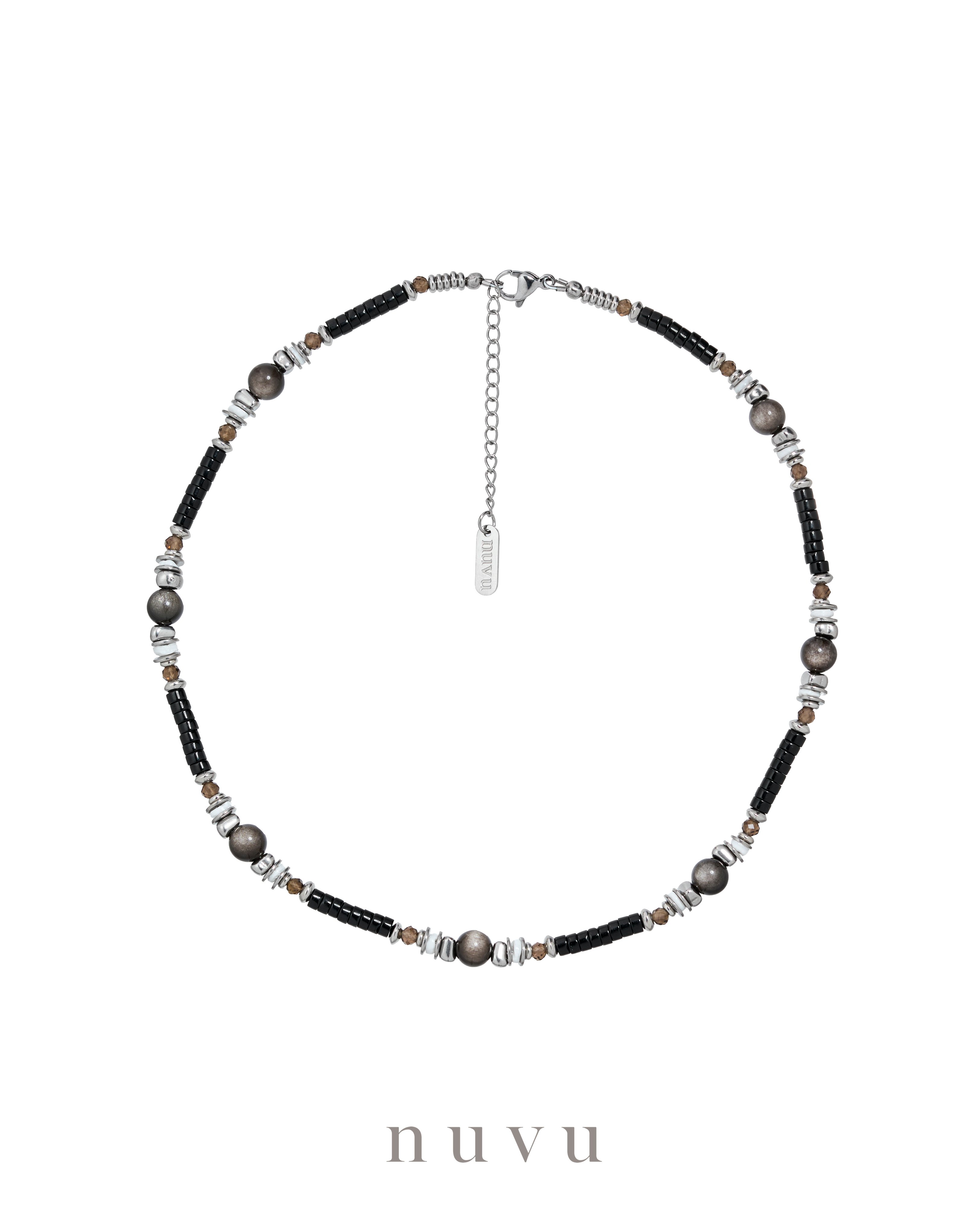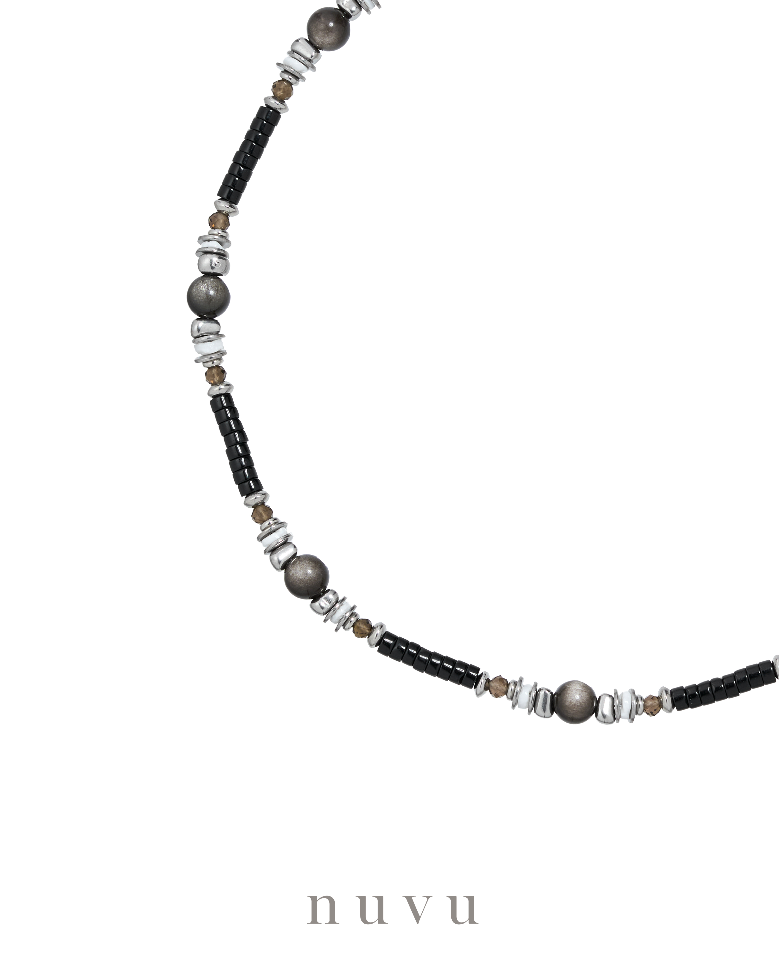 NUVU · Silverlight Guardian Series Because everyone deserves protection. Across the world — even among celebrities — the Silver Obsidian stands as one of the most powerful stones of protection. Known for its strong ability to ward off negativity and cleanse energy fields, this gemstone glimmers with a subtle silver sheen over a deep black base — like a light shining quietly in the darkness, guiding and guarding your path. The new NUVU Silverlight Guardian Series centers on Silver Obsidian,paired with the grounding calm of Smoky Quartz, the self-protective strength of Black Agate, and the gentle warmth of White Shell. Together, they create a striking palette of black, silver, brown, and white — a timeless balance of strength, clarity, and calm elegance. In ancient South American rituals, obsidian was used by shamans to dispel dark forces and protect the soul from harmful energies. Today, it continues to symbolize awakening, transformation, and inner protection. This collection is made for those standing at the crossroads of change — for those ready to let go, break through, and move forward with courage. It helps you release old patterns, see your true direction clearly, and embrace every transformation with grounded strength. This collection will absorbs negative energy and clears misfortune, allowing you to understand your needs and boundaries more deeply. It teaches you to let go, to realign, and to find emotional balance. It grounds your energy, reinforces self-confidence, and restores your sense of inner safety and power. It also harmonizes relationships — repelling toxic influences and easing tension in your social circle. Under stress, fear, or anxiety, it becomes a mirror of stillness, calming the storm within and returning you to peace. ✨ Silverlight Guardian Series — a collection that protects not only who you are today. Crystal : Silver Obsidian, Black Agate, Smoky Quartz, White Shell Material : Stainless Steel Bead size : 4-7mm Necklace : 40+5cm Delivery Time : All our designs are meticulously handcrafted, which requires time for production. Kindly allow 7-14 days for delivery to your doorstep. Any special enquiry please contact our customer service.