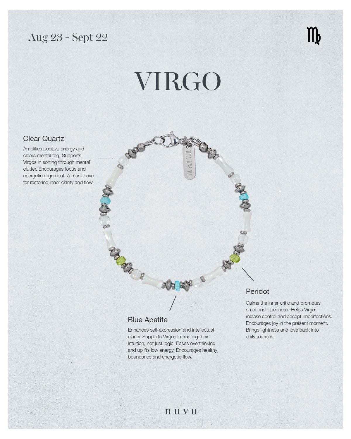 NUVU 2025 Limited Zodiac Collection September: Virgo Collection Strengths: Analytical, practical, and detail-oriented. Virgos are grounded perfectionists who seek improvement in everything they do. They are reliable and thoughtful, often serving others with quiet dedication. Challenges: Their sharp eye for detail can turn into overthinking and self-criticism. The desire for perfection may cause them to feel overwhelmed or anxious, especially when they can’t control outcomes. At times, they may struggle to express their emotional needs, hiding stress behind calm exteriors. For Virgo: 1. Clear Quartz A master amplifier that purifies thoughts and clears the mind. Supports Virgo’s focus and mental clarity while balancing overthinking. It helps realign intentions and enhances the effects of other crystals in this set. 2. Peridot Known as the “stone of renewal,” Peridot brings lightness to Virgo’s sometimes serious energy. It eases emotional tension, promotes compassion for self and others, and encourages a more joyful, heart-led approach to growth and improvement. 3. Blue Apatite Supports Virgo in expressing emotions and dreams with more clarity and confidence. Enhances insight and intuition while reducing anxiety from overanalysis. Perfect for Virgos who need to trust their inner guidance as much as their logic. For the Virgo who strives to do their best — Let this trio support your mind, soften your heart, and remind you: Your worth isn’t only in what you do, but in who you are. Crystal : Clear Quartz, Peridot, Blue Apatite Material : Stainless Steel Bead size : 5-6mm Bracelet : 16cm Delivery Time : All our designs are meticulously handcrafted, which requires time for production. Kindly allow 7-14 days for delivery to your doorstep. Any special enquiry please contact our customer service.
