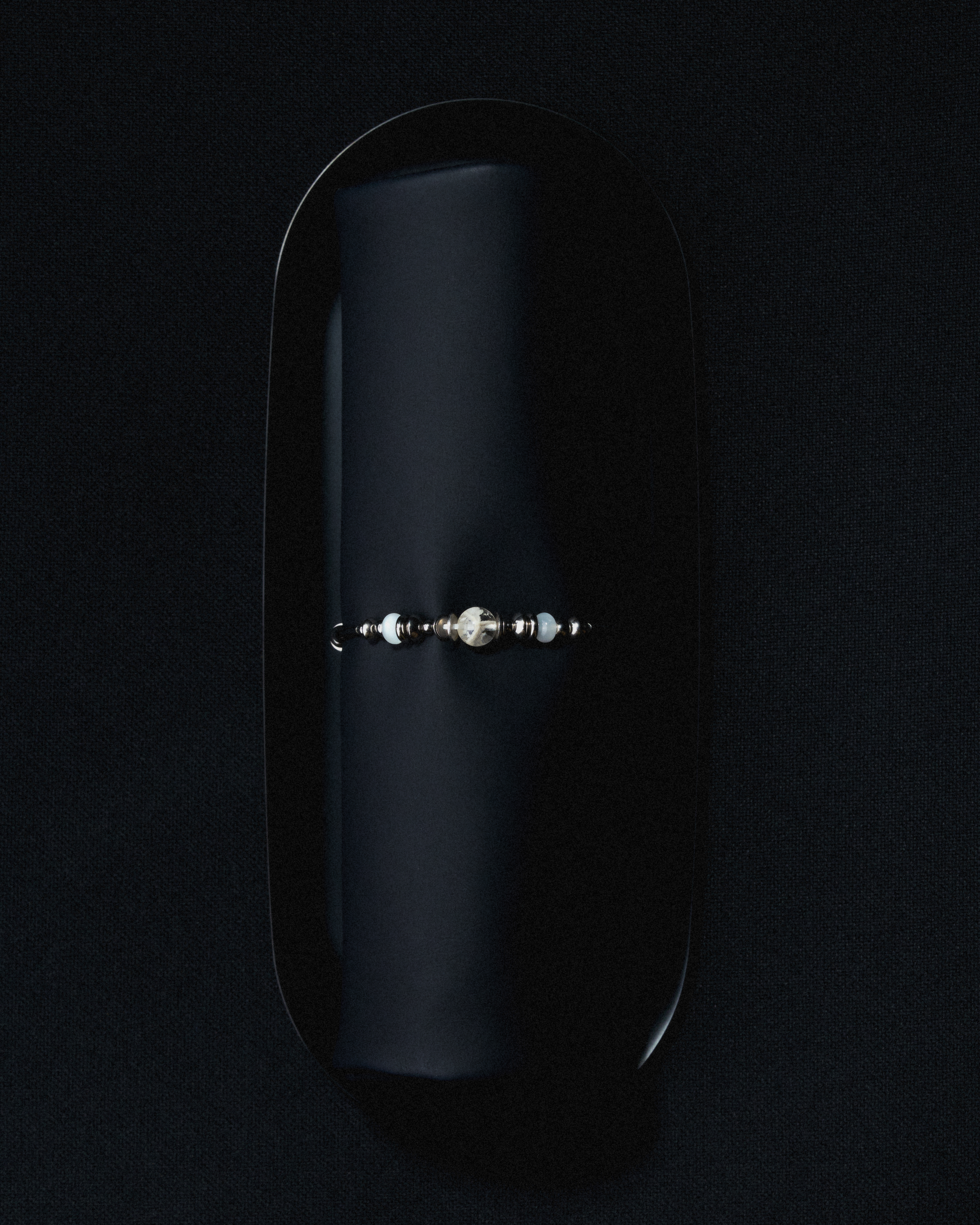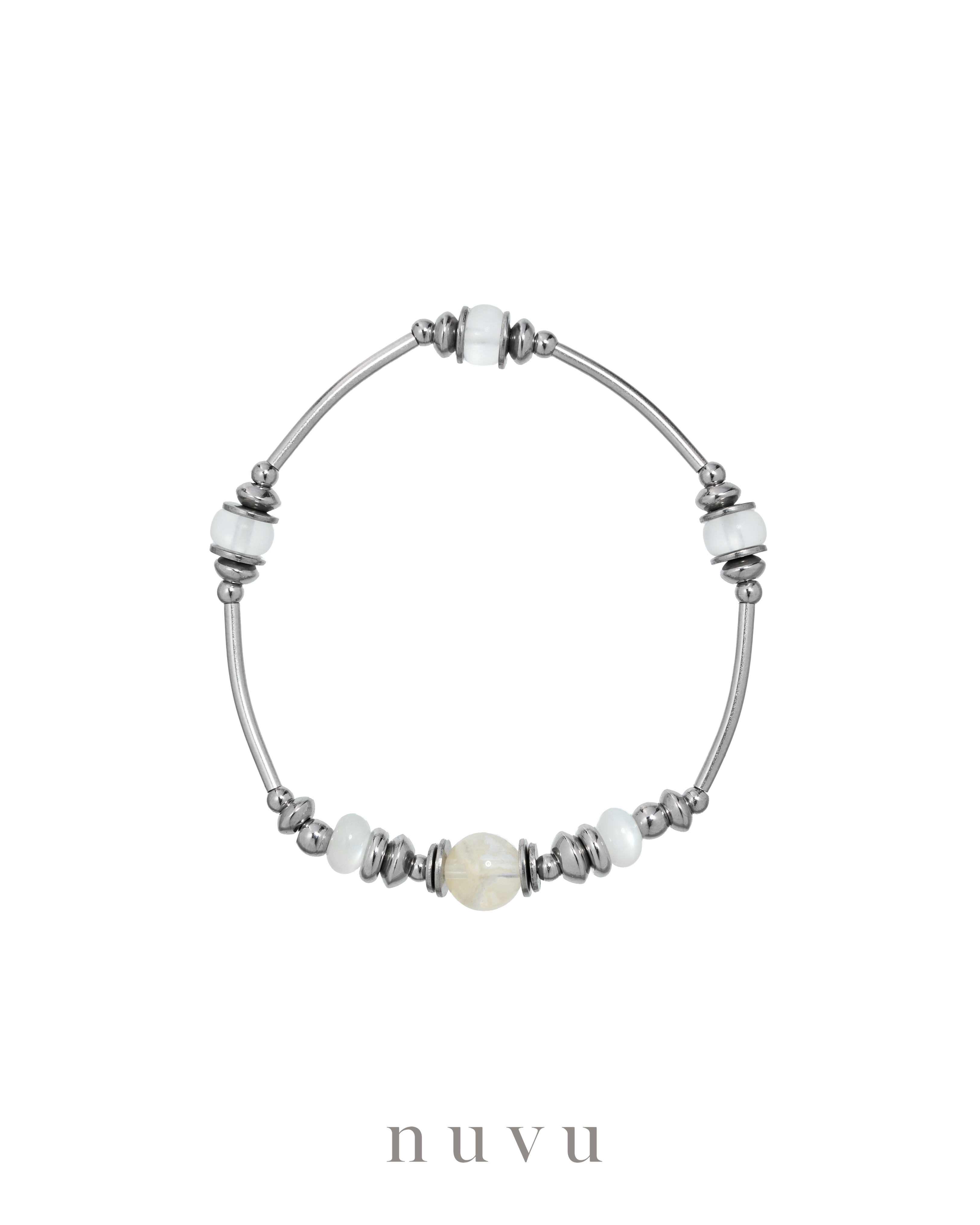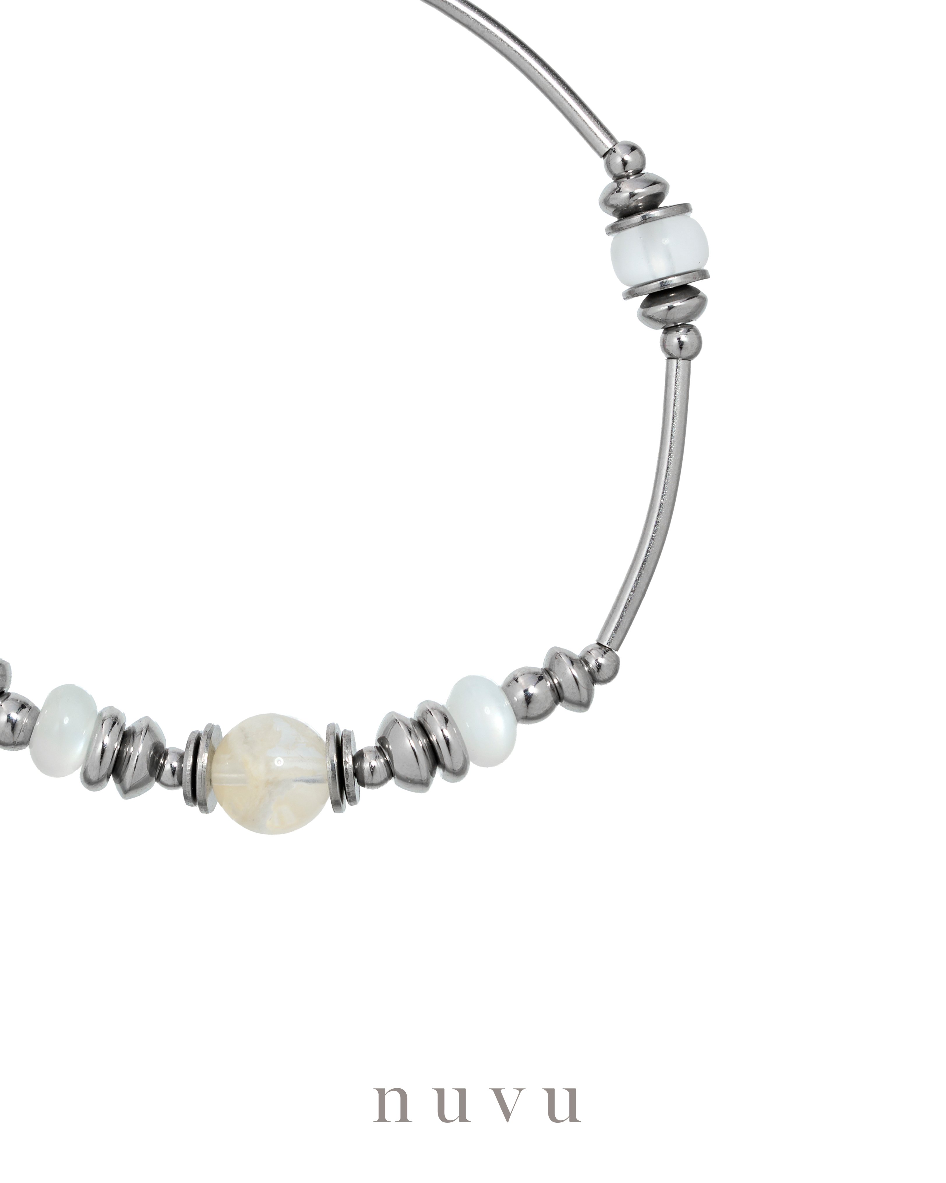 This series features Sericite Mica, its crystalline layers scattered like frozen feathers within clear stone, paired with White Moonstone for a soft, luminous glow. Together, they create a calm yet captivating presence—never loud, but impossible to ignore.