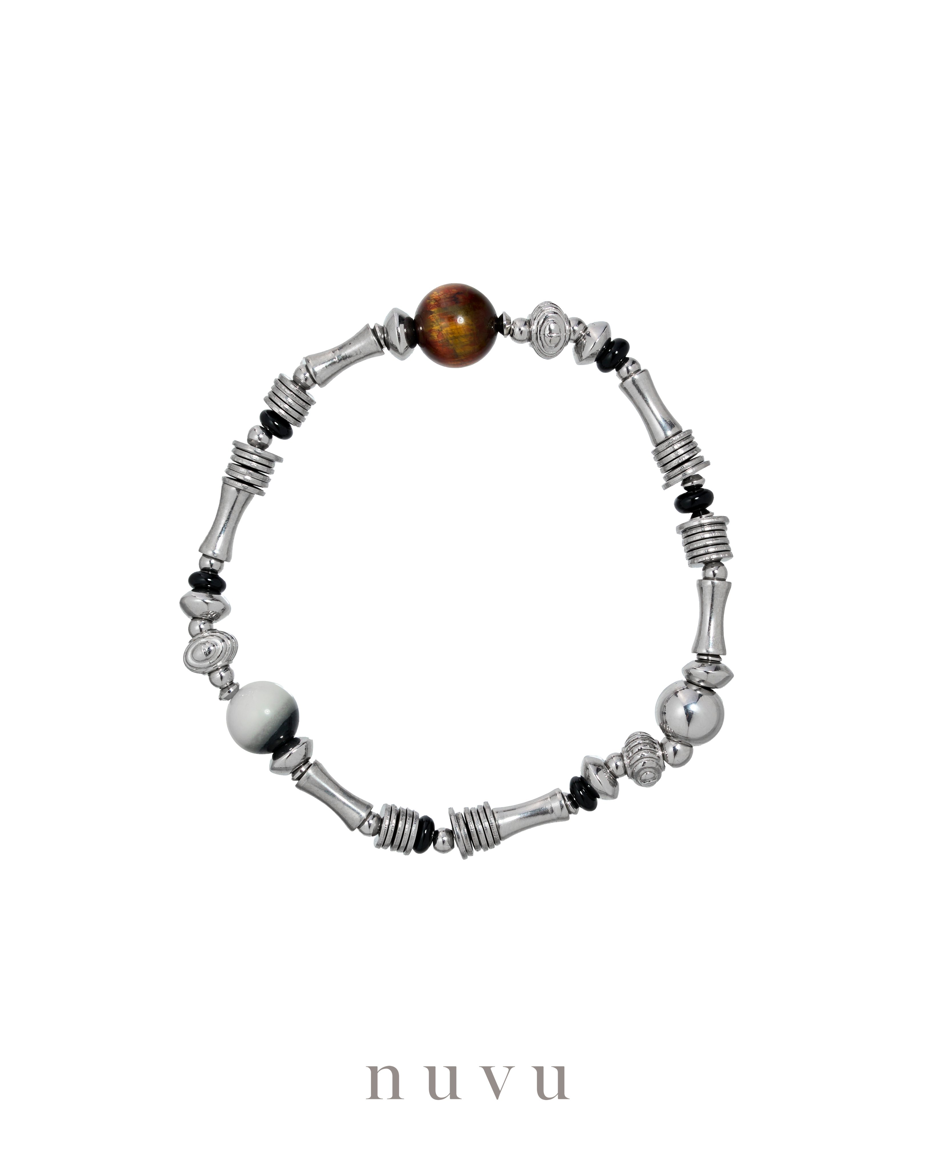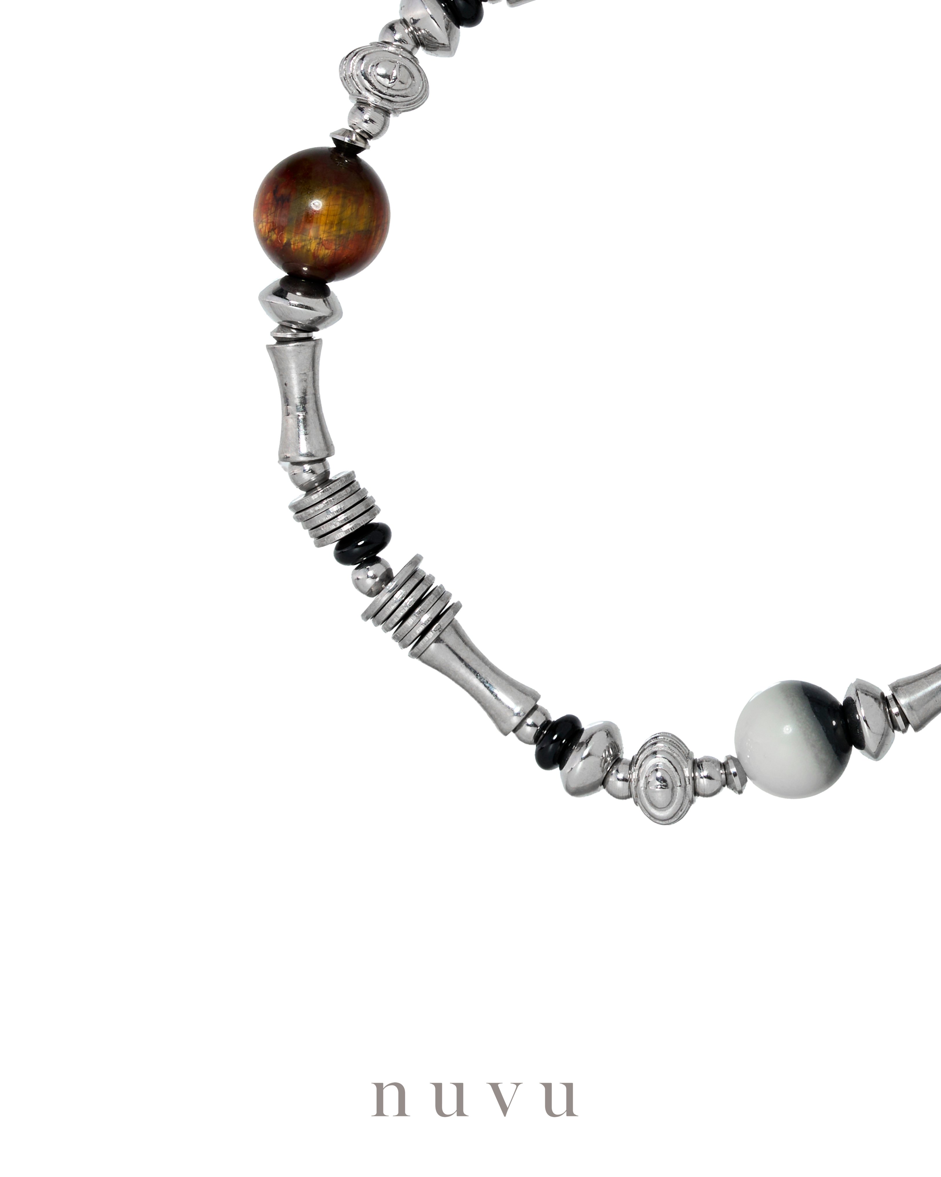 NUVU · Yin Balance Series Balance isn’t about choosing sides — it’s about letting opposing forces work together. Inspired by the philosophy of yin and yang, the Yin Balance Series centers on Tai Chi Stone, where black and white energies coexist in perfect harmony. Each stone represents the interaction and alignment of positive and negative magnetic forces — reminding us that true strength comes from balance, not extremes. Paired with South African Pietersite, known for its striking yellow and red storm-like patterns, this series amplifies breakthrough energy. The contrast of black and white, yellow and red, mirrors life itself — tension and release, stillness and action — transforming contrast into momentum, luck, and growth. The white side of Tai Chi Stone activates positive flow, supporting wealth attraction and turning stagnant situations around. The black side absorbs negativity and unwanted energy, helping clear fatigue, restore vitality, and strengthen overall resilience. To complete the balance, Black Agate is added as the grounding force — cutting through confusion, blocking negative influences, and protecting against bad luck and disruptive people. It keeps your direction clear when life feels overwhelming. At the heart of the series, Pietersite fuels courage and confidence. Often called the “Stone of Storms,” it pushes you to move forward even in uncertainty, helping you break inner limits, face challenges head-on, and unlock new opportunities aligned with growth and abundance. ✨ Yin Balance Series A reminder that when clarity meets courage, and protection meets momentum, you don’t just survive change — you move through it with power and purpose. Crystal : Petersite, Black Agate, Taichi stone Material : Stainless Steel Bead size : 8-10mm Bracelet : 16cm Delivery Time : All our designs are meticulously handcrafted, which requires time for production. Kindly allow 7-14 days for delivery to your doorstep. Any special enquiry please contact our customer service.